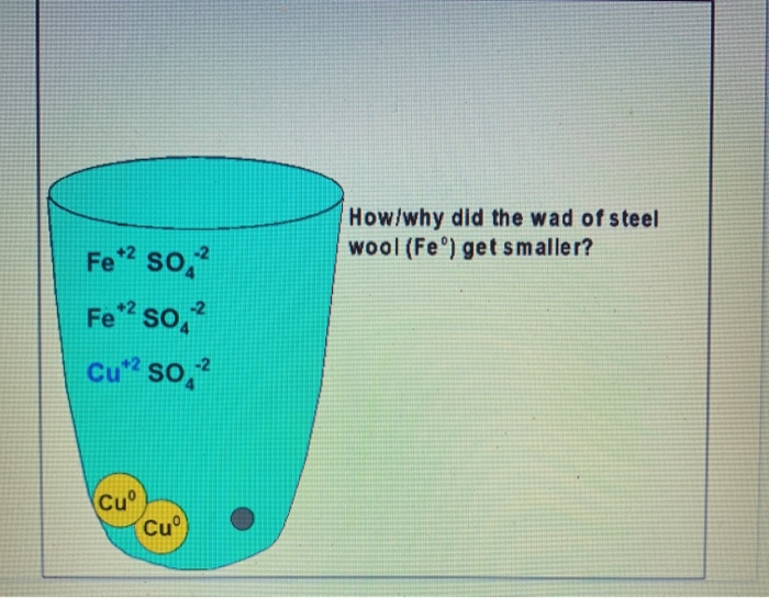 Describe how to use steel wool which is made mostly of iron to remove the Cu 2 ions from an aqueous solution of copperII sulfate. After reaction chemical equation Fe CuSo4 FeSo4 Cu steel wool copper sulfate Iron ii sulfate copper Florence. Soak some steel wool in white vinegar for a few hours or a few days the longer it steeps the darker the aged effect will be.