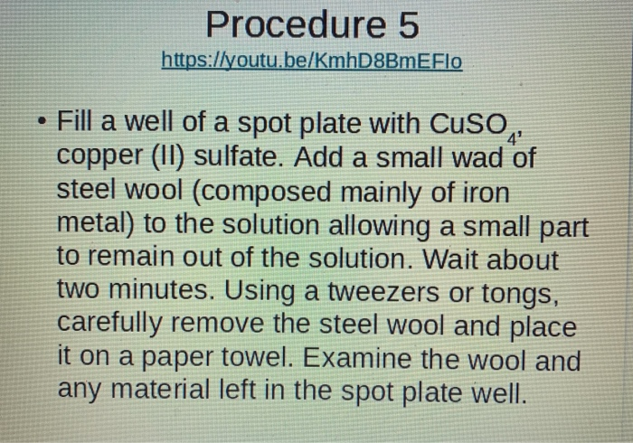 Due to the fact that the iron in the steel wool chemically reacts with the aqueous solution we can conclude that during the reaction the iron displaces the copper. B Copper compounds such as copperll sulfate are toxic. Use scissors to cut the 0000 grade steel wool from the bundle and then measure the mass to get 20 grams.